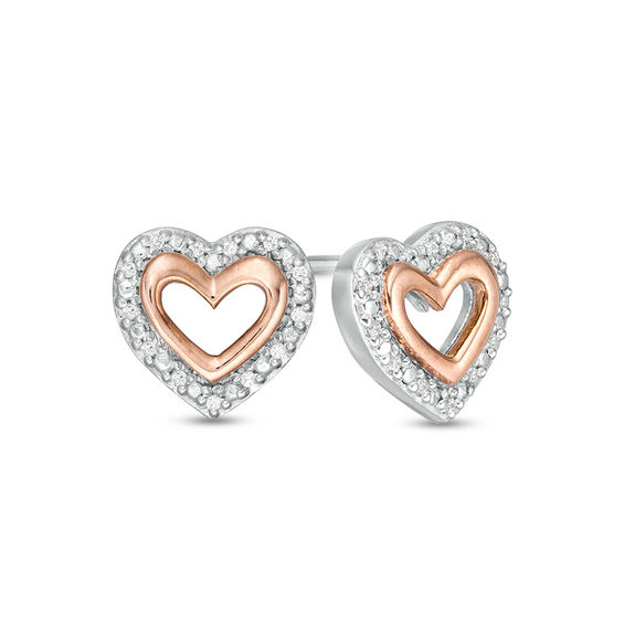 Express your affection with these dainty diamond heart stud earrings. Crafted in sterling silver and 10K rose gold, each earring features an open rose gold heart wrapped in a sparkling heart-shaped silver and diamond outline. Radiant with 0.04 ct. t.w. of diamonds and a brilliant buffed lustre, these post earrings secure with screw backs.