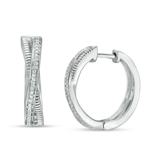 Modern and smart, these diamond hoop earrings are a versatile addition to her jewellery box. Crafted in sterling silver, each sleek hoop showcases a shimmering diamond-lined bar crossing over a grooved bar. Sparkling with 0.065 ct. t.w. of diamonds and a brilliant buffed lustre, these earrings secure with hinged backs.