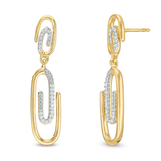 Certain to delight, these diamond paper clip drop earrings make a big visual impact. Crafted in sterling silver with 14K gold plate, each vertically oriented symbol of stability is playfully adorned with sparkling diamonds. Above, diamond-touched paper clip posts complete the look. Radiant with 0.066 ct. t.w. of diamonds and a bright polished shine, these sure-to-be-noticed earrings secure comfortably with friction backs.