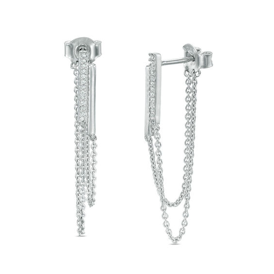 With shimmer and movement, these diamond chain drop earrings add an extra dimension of style to your look. Crafted in sterling silver, each earring features a vertical dual-bar design – one side polished and the other lined with glimmering diamonds – decorated with two loops of chain that connect to the earring back. Radiant with 0.09 ct. t.w. of diamonds and a bright polished shine, these chain loop earrings secure comfortably with friction backs.
