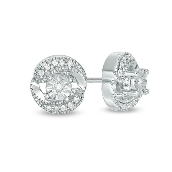 Petite and shimmering, these diamond stud earrings are an everyday look she’ll love. Crafted in sterling silver, each earring features a diamond – artfully set to enhance size and sparkle – wrapped in a slim diamond swirl halo frame. Radiant with 0.10 ct. t.w. of diamonds and a brilliant buffed lustre, these post earrings secure comfortably with friction backs.