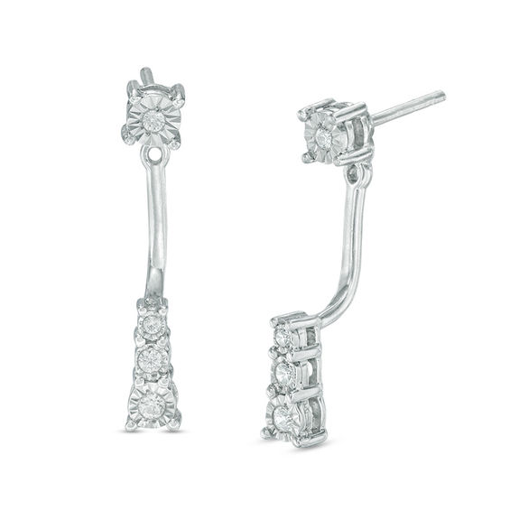 Easy to elegant, these bright diamond front/back earrings make day to evening transition a breeze. Crafted in cool 10K white gold, each earring features a post that shimmers with a single diamond artfully set to enhance size and sparkle. Wear this earring with or without the three-diamond drop jacket that shows from beneath the earlobe to vary the look any time. Radiant with 0.15 ct. t.w. of diamonds and a brilliant buffed lustre, these earrings secure comfortably with friction backs.