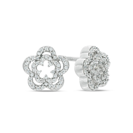 Fun and flirty, these diamond flower stud earrings are a joyful choice for day or evening wear. Crafted in sterling silver, each earring features an open flower border lined with diamonds. Inside, a smaller diamond-adorned frame features a reverse flower cutout for a shimmering look. Radiant with 0.18 ct. t.w. of diamonds and a bright polished shine, these post earrings secure comfortably with friction backs.