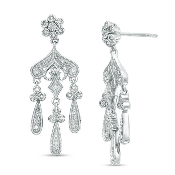 Bring the sparkle to your dressy looks with these gorgeous vintage-inspired diamond drop earrings. Crafted in sterling silver, each elegant chandelier-style earring showcases a beautiful filigree motif with three pear-shaped dangles suspended from trios of round frames – all adorned with dazzling petite diamonds and intricate milgrain detailing. The post shimmers with a flower-like composite of diamonds in milgrain-lined frames. Captivating with 0.18 ct. t.w. of diamonds and a bright polished shine, these post earrings secure comfortably with friction backs.