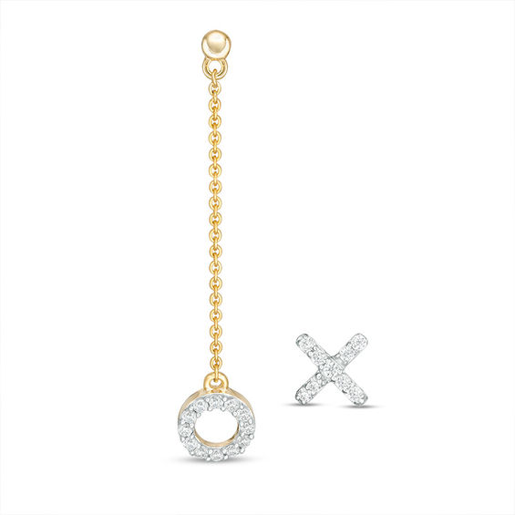 Craft a complete design scene with this diamond earrings set. Created in 10K gold, one earring features a polished half-ball post and a diamond-lined open circle at the end of a length of chain. A complementary diamond crossed stud completes the look. Radiant with 0.18 ct. t.w. of diamonds and a bright polished shine, these mismatched post earrings secure comfortably with friction backs.