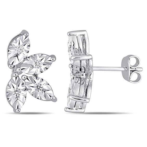 These dainty diamond stud leaf spray earrings are a charming design. Crafted in sterling silver, each earring shimmers with four bezel-set diamonds – each artfully set to enhance size and sparkle – in marquise-shaped frames. Radiant with 0.24 ct. t.w. of diamonds and a brilliant buffed lustre, these post earrings secure comfortably with friction backs.
