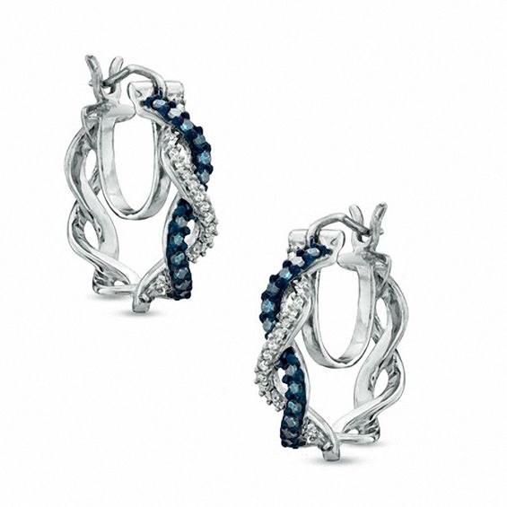 These diamond hoop earrings are simple, stylish and perfect just about any time. Swirling loosely braided ribbons of sleek sterling silver are lined with shimmering white and enhanced blue diamonds and twisted together, creating these engaging earrings. These hoops captivate with 0.25 ct. t.w. of diamonds and a bright polished shine. The earrings secure comfortably with hinged backs.