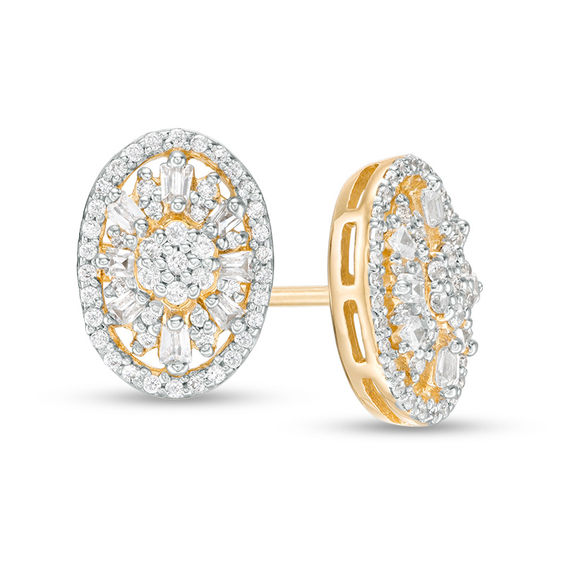 Amp up your fashion volume with these dainty diamond fancy-shape stud earrings. Crafted in warm 10K gold, each earring shimmers with a flower-shaped composite of sparkling diamonds wrapped in a sunburst frame of round and baguette-cut diamonds – inside an open diamond-lined frame. Radiant with 0.30 ct. t.w. of diamonds and a brilliant buffed lustre, these oval-shaped earrings secure comfortably with friction backs.
