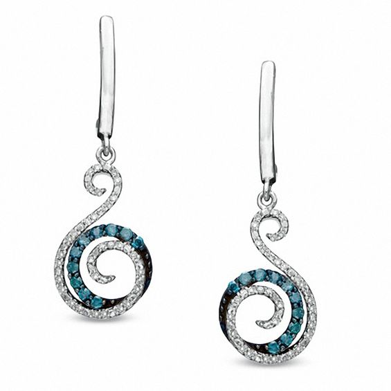 Dazzling curliques of shimmering diamonds create eye-catching earrings that captivate wearer and beholder alike! Fashioned in sleek sterling silver, these swirling drops are each lined with elegant enhanced blue and shimmering white diamonds. These glittering drops suspend from simple linear post settings. Radiant with 0.33 ct. t.w. of diamonds and a bright polished shine, these earrings secure comfortably with friction backs.