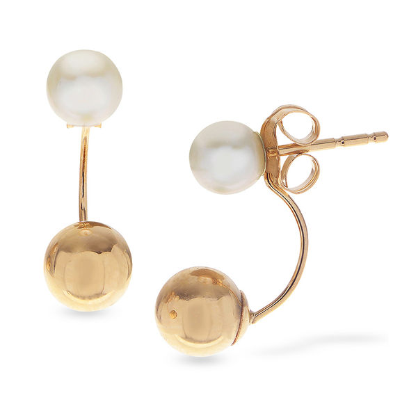Add an elegant touch to any attire with these on-trend pearl front/back earrings. Created in 14K gold, each stylish earring features a lustrous 5.0-5.5mm cultured freshwater pearl post and a gleaming ball drop suspended from the earring back. Polished to a bright shine, these earrings secure with friction backs.