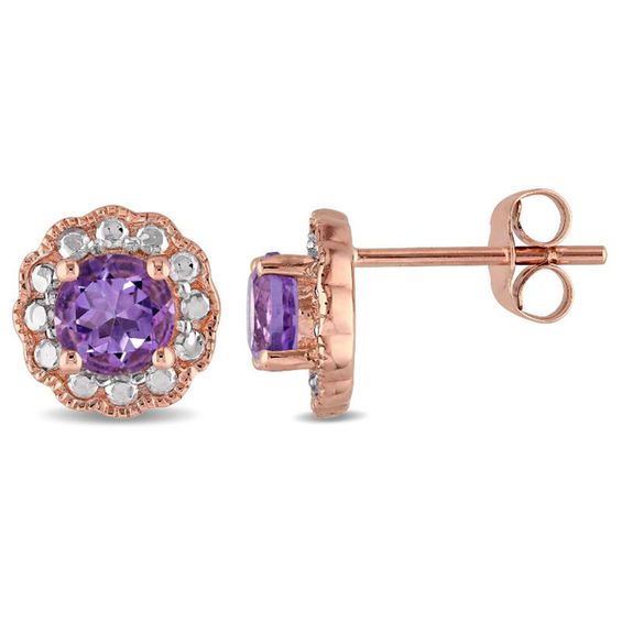 Spring into the season with these sweet and shimmering vintage-inspired gemstone stud earrings. Crafted in precious 10K rose gold, each floral-styled earring is centred with a dazzling 5.0mm bright purple amethyst centre stone. A pretty petal frame composed of polished beading and intricate milgrain detailing completes this charming choice. Buffed to a brilliant lustre, these clever post earrings secure comfortably with friction backs.