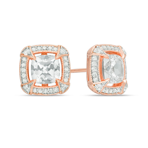 Graceful and glamorous, these vintage-inspired stud earrings offer romantic style. Crafted in sterling silver with rose rhodium plate, each stunning earring showcases a 6.0mm cushion-cut lab-created shimmering white sapphire wrapped in an open frame of sparkling petite diamonds with intricate milgrain detailing. Sculpted compass accents with petite created white sapphires and milgrain detailing adorn the frame. Radiant with 0.20 ct. t.w. of diamonds and a brilliant buffed lustre, these post earrings secure comfortably with friction backs.