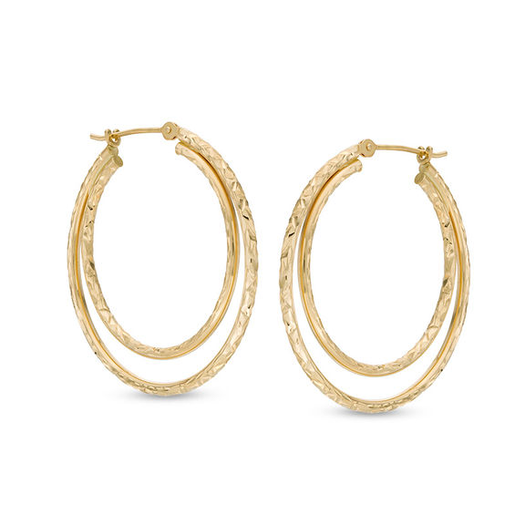 Elevate any attire with these classic hoop earrings. Fashioned in warm 10K gold, each glittering double hoop shimmers with a diamond-cut texture that catches and reflects light. Buffed to a brilliant lustre, these earrings secure with latch backs.