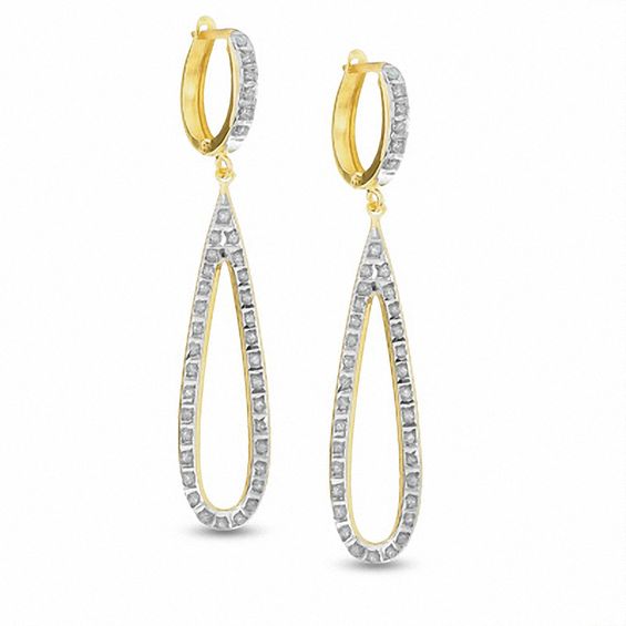 These 14K gold Diamond Fascination open teardrop dangle earrings have hinged backs. Each earring has a diamond-cut finish with a round single cut diamond and is rhodium plated to help maintain shine and prevent tarnishing. Diamond Fascination is a breakthrough in the art of creating diamond accent jewellery. Diamond Dust Pavé is a patented manufacturing process that combines genuine diamonds and genuine diamond dust set in 14K gold.