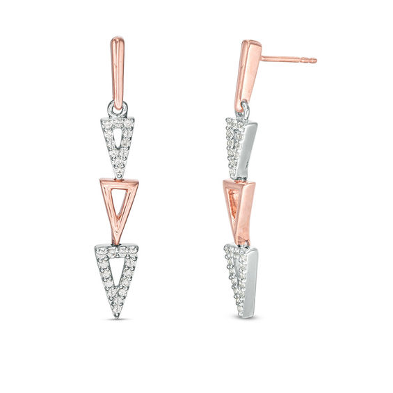 Elevate your attire with these contemporary and chic drop earrings. Crafted in sterling silver, each geometric earring showcases a vertical row of three triangle outlines: two lined with shimmering petite lab-created white sapphires and one in 10K rose gold in the middle. Buffed to a brilliant lustre, these linear 10K rose gold post earrings secure comfortably with friction backs.