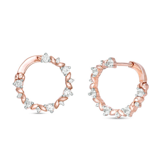 Surprise her with these darling nature-inspired flat hoop earrings. Crafted in precious 10K rose gold, each pretty hoop features sparkling multi-size lab-created white sapphires and gleaming leaf shapes alternating along a circle that cleverly closes behind the earlobe. Polished to a bright shine, these earrings secure with latch backs.