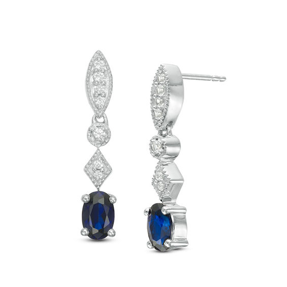 Sheâll treasure the vintage-inspired details of these geometric drop earrings. Crafted in sterling silver, each romantic earring features a cascade of a marquise-, circle- and kite-shaped frames – each adorned with sparkling petite lab-created white sapphires and intricate milgrain detailing – and a 6.0 x 4.0mm oval-shaped lab-created bright blue sapphire at the base. Buffed to a brilliant lustre, these post earrings secure comfortably with friction backs.