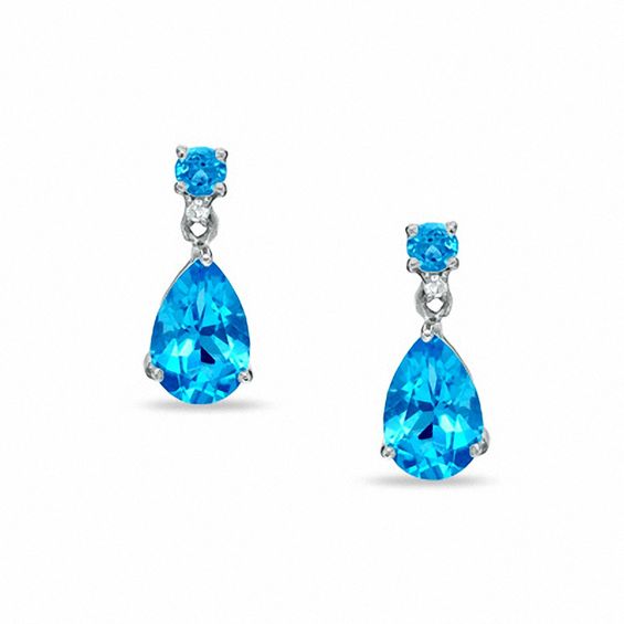 Beautiful gemstones are guaranteed to brighten her smile. Bold and beguiling, each of these 10K white gold drop earrings features a dazzling 9.0 x 6.0mm pear-shaped blue topaz suspended below a 3.0mm round blue topaz. A single shimmering diamond accent separates the two stones. Polished to a brilliant shine, these post-style earrings secure comfortably with friction backs.