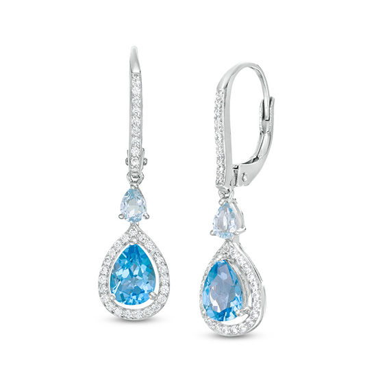With sparkle to spare, these divine gemstone earrings appeal to her glamorous style. Crafted in sterling silver, each beautiful drop showcases a 7.0 x 5.0mm pear-shaped Swiss blue topaz dangle wrapped in a frame of shimmering lab-created white sapphires. A 4.0 x 3.0mm pear-shaped sky-blue topaz connects the drop to the created sapphire-lined ear wire. Polished to a bright shine, these earrings secure with lever backs.