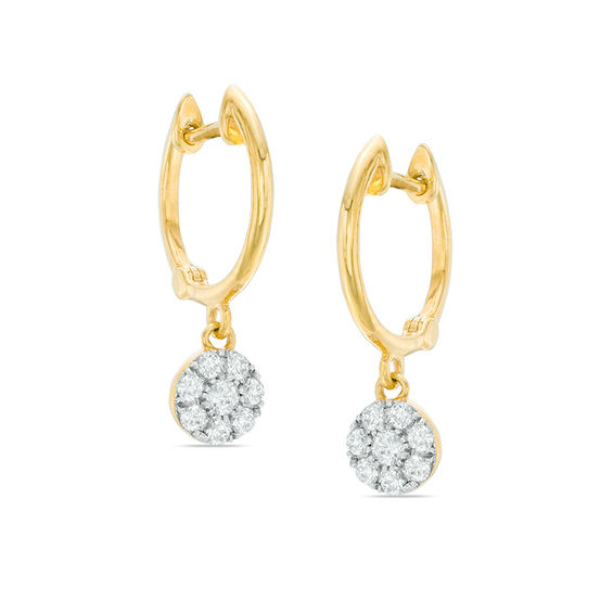 A dazzling and dainty look, these drop hoop earrings are a lovely addition to her jewellery wardrobe. Created in warm 10K gold, each earring dangle features a round composite of shimmering diamonds. Radiant with 0.25 ct. t.w. of diamonds and a bright polished shine, these earrings secure comfortably with hinged backs.