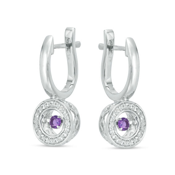 Celebrate your growing and evolving romance with these lovely gemstone drop earrings from the Unstoppable Love™ Collection. Crafted in sterling silver, each earring features a circular drop lined with lab-created white sapphires. Inside, a 2.6mm bright purple amethyst shimmers in a unique setting that moves with every turn of her head. Buffed to a brilliant lustre, these petite hoop earrings secure with hinged backs.