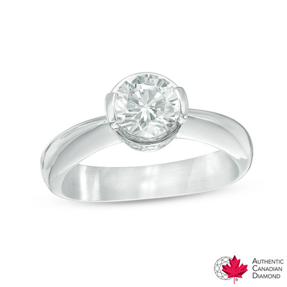 This 1.06 ct. t.w. diamond solitaire with side accents engagement ring set in 14K white gold features a 1.00 ct. certified diamond centre stone, with a colour ranking of J and clarity of I2. Certified Canadian diamonds are accompanied with a Certificate of Authenticity under the Canadian Federal Government Code of Conduct guaranteeing its Canadian origin. The engagement ring arrives with a certificate that includes a photo and description of the diamonds, which guarantees quality and can be used for insurance purposes.