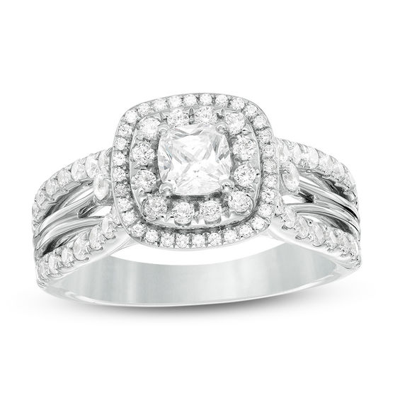 Vow to honour her with this exquisite certified diamond engagement ring. Crafted in cool 14K white gold, this design features a dazzling 0.50 ct. certified Canadian cushion-shaped diamond – boasting a colour rank of I and clarity of I1 – wrapped in a double frame of diamonds. Additional diamonds flank the centrepiece and adorn the ring’s wide double-split shank. Radiant with 1.25 cts. t.w. of diamonds and a brilliant buffed lustre, this engagement ring is designed to impress. This style arrives with a certificate that includes a photo and description of the diamond, which guarantees quality and can be used for insurance purposes.