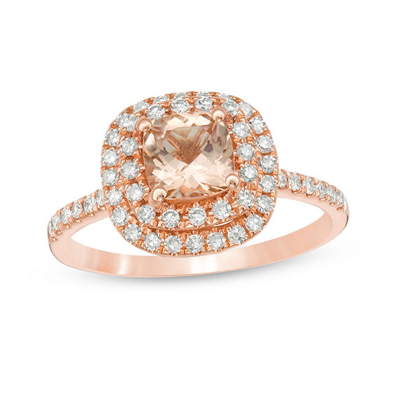 She’ll be at the centre of everyone’s attention with this breathtaking gemstone and diamond ring glistening upon her finger. Created in precious 10K rose gold, this luxe and lovely style features a 6.0mm cushion-cut soft-pink morganite surrounded by a duo of stepped diamond-touched frames. Diamonds sparkle along each side of the slender shank, ensuring eye-catching shimmer with each turn of her wrist. Captivating with 0.35 ct. t.w. of diamonds and a brilliant buffed lustre, this ring is a sweeping choice paired with her tailored wardrobe.