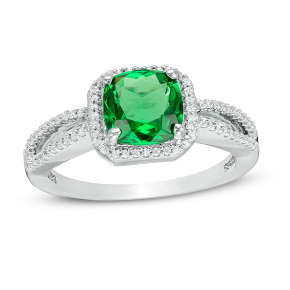 Start your endless love story with this gorgeous engagement ring. Created in cool 10K white gold, this remarkable style gleams with a 7.0mm cushion-cut lab-created verdant-green emerald wrapped in a sparkling octagon-shaped frame of petite diamonds – atop a shimmering diamond-lined split shank. Captivating with 0.115 ct. t.w. of diamonds and a bright polished shine, this engagement ring is the perfect way to begin your shared lifetime of love.