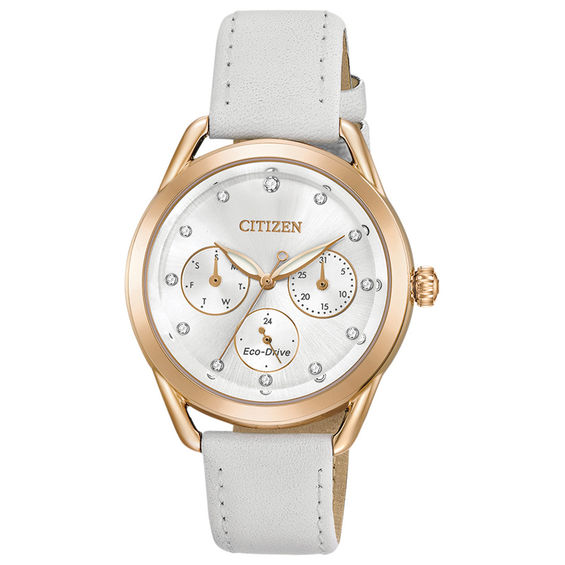She’ll appreciate the sporty look and functionality of this Drive from Citizen Eco-Drive® timepiece. Crafted in rose-toned stainless steel, this quality watch features a 38.0mm case, silver-toned dial, rose-toned bezel, sparkling crystal markers, luminous hands, day/date and 24-hour sub-dials, and second hand. The white leather strap secures with a buckle clasp. Ensuring accuracy, the Japanese quartz movement keeps you right on time. Citizen Eco-Drive® technology harnesses the power of any light source so this style never needs a new battery. Water-resistant to 30 metres, this wristwatch includes a five-year limited manufacturer’s warranty. We are an authorized Citizen dealer.