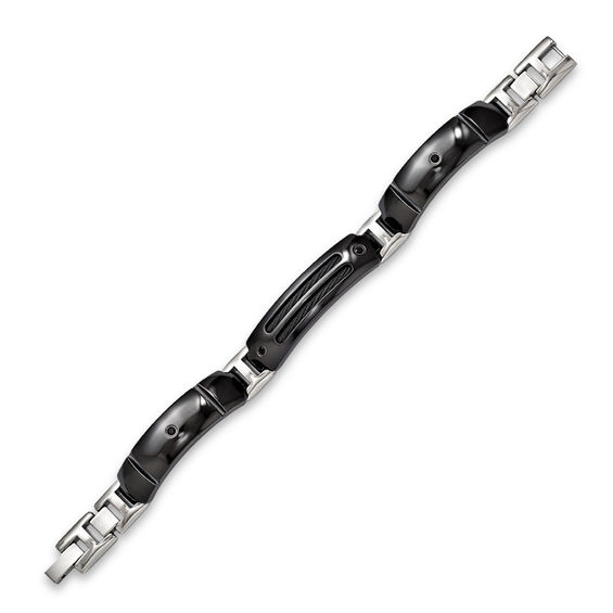 For the stylish, modern man who appreciates his personal and unique fashion sense, this bracelet from the Midnight Cable collection is the perfect fit. Expertly crafted in durable black titanium and sleek sterling silver, two twisted cable inlays across the centre create a stunning visual. Adding subtle lustre, shimmering black spinel complete the design. Polished to a bright shine, the bracelet measures 8.0-inches in length and secures with a fold-over clasp. Crafted of the finest pure-grade titanium for durability, value and beauty, Edward Mirell’s contemporary jewellery collection exudes elegant workmanship through every facet.