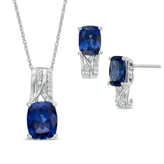 Celebrate her September birthday with this exquisite pendant and earrings set. Expertly crafted in sterling silver, this pendant showcases 6.0 x 10.0mm cushion-cut lab-created Ceylon blue sapphire center stone topped with shimmering lab-created white sapphires. The post earrings follow the same exceptional design. Polished to a brilliant shine, the pendant glides freely along an 18.0-inch rope chain that secures with a spring-ring clasp. The earrings secure comfortably with friction backs. A memorable look she’s certain to adore, this set arrives beautifully boxed and ready for giving.