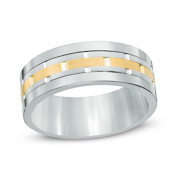 This men’s 8.0mm brick pattern centre stripe wedding band is fashioned in tungsten and 10K gold. The inside of the band is rounded for comfort. Due to the nature of pre-owned jewellery, the ring you choose may have been previously sized. Ring styles from our pre-owned jewellery inventory are sold at their current size and cannot be resized at purchase. As this inventory constantly changes, we are unable to state or guarantee the size of any pre-owned ring.
