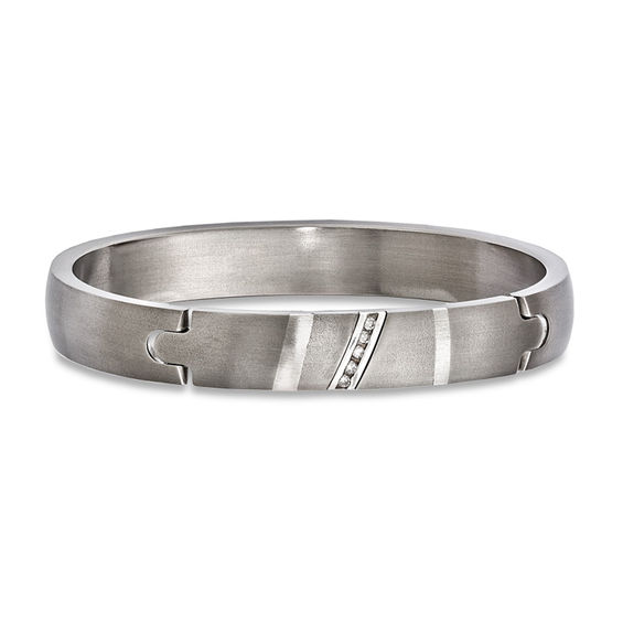 Sophistication, style and personality – this Edward Mirell Rapture bangle bracelet has it all. Stunning in titanium, this fashion-forward look features a trio of diagonal sterling silver inserts, one channel set with dazzling diamonds totalling 0.09 ct. A remarkable look for a remarkable man, this 7.5-inch style secures with a fold-over clasp. Crafted of the finest pure-grade titanium for durability, value and beauty, Edward Mirell’s contemporary jewellery collection exudes elegant workmanship through every facet.