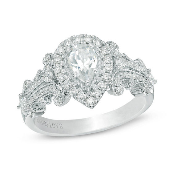 Unmistakably elegant, this diamond engagement ring from the Vera Wang Love Collection will sweep her off her feet. Crafted in 14K white gold, the eye is drawn to the 0.45 ct. pear-shaped diamond centre stone bordered with a frame of smaller round accent diamonds. Swirling diamond-lined ribbons flank the centre cluster and create the ring’s double shank. Set into the ring’s bezel are two princess-cut blue sapphires, the signature of the collection and a symbol of faithfulness and everlasting love. A regal and romantic gift of love, this ring captivates with 1.00 ct. t.w. of diamonds and a polished shine. Vera Wang is exclusively ours.