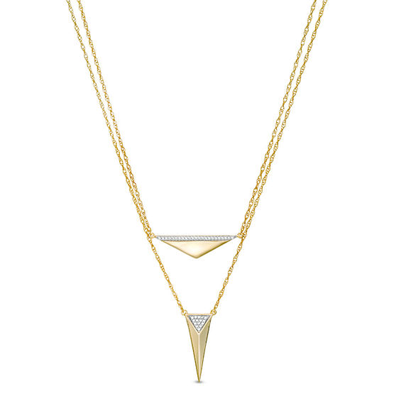 Sparkling with modern design, this diamond necklace is a striking addition to her jewellery box. Fashioned in warm 10K gold, this geometric look showcases an elongated horizontal triangle shimmering with a row of diamonds along the top edge – all centred along an 18.0-inch rope chain. Completing this double-strand style, a sculpted vertical triangle gleams with a composite of diamonds along a 20.0-inch length of chain. Captivating with 0.085 ct. t.w. of diamonds and a bright polished shine, this necklace secures with a spring-ring clasp.