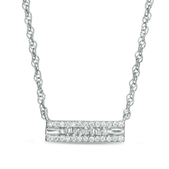 Amp up your look with this pretty diamond bar necklace. Crafted in sterling silver, this dainty rectangle features a centre row of sparkling baguette-cut diamonds edged top and bottom with a row of petite diamonds. Radiant with 0.115 ct. t.w. of diamonds and a bright polished shine, this bar suspends centred along a 17.5-inch rope chain that secures with a spring-ring clasp.
