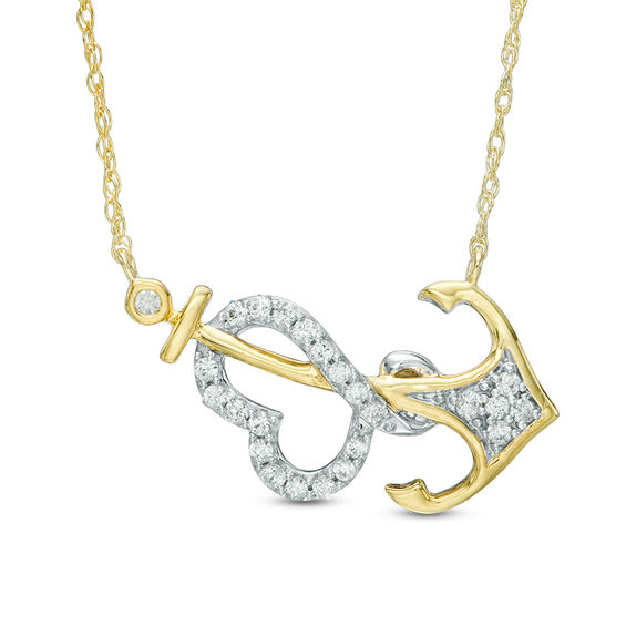Cute and modern, this diamond necklace is a great look any day. Fashioned in warm 10K gold, this nautical style is centred with a sideways anchor curved ever so slightly and adorned at each end with dazzling diamonds. A clever heart-shaped white gold ribbon – lined with additional diamonds – wraps around the centrepiece, adding a touch of whimsy to the choice. Radiant with 0.15 ct. t.w. diamonds, this design suspends centred along an 18.0-inch rope chain that secures with a spring-ring clasp.