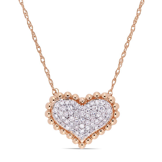 Show your devotion with this shimmering diamond heart necklace. Crafted in precious 10K rose gold, this stylized heart-shaped design sparkles with a diamond-encrusted centre and a frame of polished bead details. Endearing with 0.23 ct. t.w. of diamonds and a brilliant buffed lustre, this heart drop suspends centred along a 17.0-inch rope chain that secures with a spring-ring clasp.