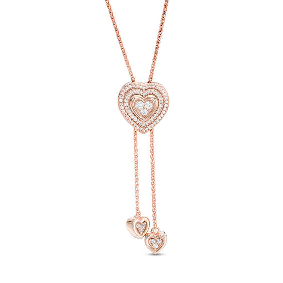 A shimmering token of your love, this romantic diamond heart lariat bolo necklace marks any special occasion with style. Crafted in sterling silver with 14K rose gold plate, this adjustable lariat features a trio of sparkling diamonds wrapped in a polished heart border and two diamond-lined frames. Vary the look by re-centring the bolo design along the lariat chain. Radiant with 0.23 ct. t.w. of diamonds and a brilliant buffed lustre, this wheat chain necklace adjusts up to 26.0 inches in length and is finished with heart-shaped diamond-touched drops.