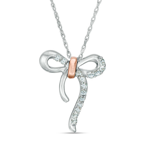 Decorate your party look with this feminine gemstone necklace. Crafted in sterling silver, this darling piece is centred with a sweet looping bow – lined partly with petite icy-blue aquamarines and finished with a polished 10K rose gold detail. Buffed to a brilliant luster, this 18.0-inch rope chain necklace secures with a spring-ring clasp.