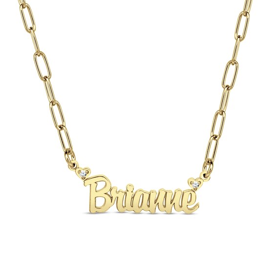 Spell out her name in sweetest style with this charming personalized necklace. Crafted in your choice of metal, this design showcases a name or message – up to eight characters in length – sculpted in a script font. Dainty diamond-accented heart details shimmer on each side. Polished to a bright shine, this word art suspends centred along an 18.0-inch cheval chain that secures with a spring-ring clasp.