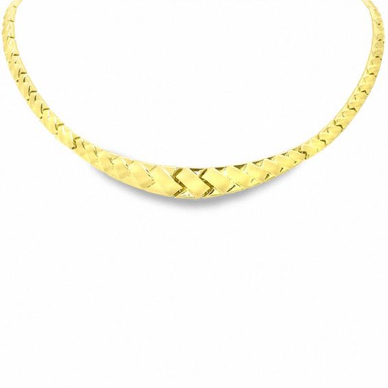 Smoothly decorated with stampato designs, the dazzling 10K gold links of this graduated necklace sweep across her collarbones, reminiscent of exotic jewellery from far-off lands. The necklace hangs 17.0 inches in length.