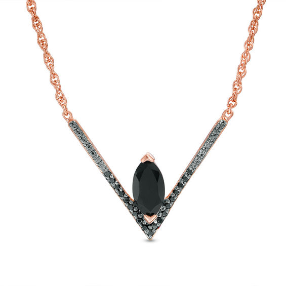 Chic and on-trend, this gemstone and diamond pendant suits her modern vibe. Crafted in sterling silver with 14K rose gold plate, this stylish chevron-shaped design showcases a 9.0 x 4.5mm marquise-shaped rich black onyx artfully set along a black rhodium-plated row of alluring enhanced black diamonds. Captivating with 0.085 ct. t.w. of diamonds and a bright polished shine, this look suspends centred along a 17.0-inch rope chain that secures with a spring-ring clasp.