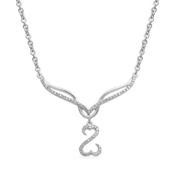 This elegant fashion necklace from Open Hearts by Jane Seymour™ takes her look to a new level. Crafted in sterling silver, the fixed centerpiece features polished and dazzling diamond-lined ribbons that layer in a dual-chevron style. Below, an open hearts dangle lined with shimmering diamond accents captures her attention. Buffed to a brilliant luster with 0.07 ct. t.w. diamond, this 17.0-inch cable chain necklace secures with a lobster claw clasp.