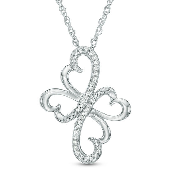 Thoughtful and feminine, this diamond heart cross pendant is certain to be treasured. Crafted in sterling silver, this open design features whimsical heart-shaped edges artfully adorned with sparkling diamonds. Captivating with 0.07 ct. t.w. of diamonds and a bright polished shine, this pendant suspends along an 18.0-inch rope chain secures with a spring-ring clasp.