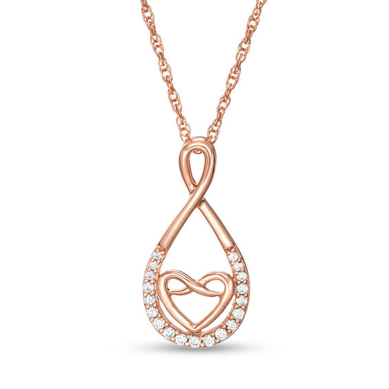Elegant and alluring, this diamond infinity pendant is certain to steal her heart. Created in precious 10K rose gold, this sumptuous design features an artful infinity symbol shape adorned with a row of shimmering diamonds at the base. Nestled within, a polished heart outline with an infinity symbol-shaped top lends interest to the look. Radiant with 0.086 ct. t.w. of diamonds and a brilliant buffed lustre, this pendant suspends along an 18.0-inch rope chain that secures with a spring-ring clasp.