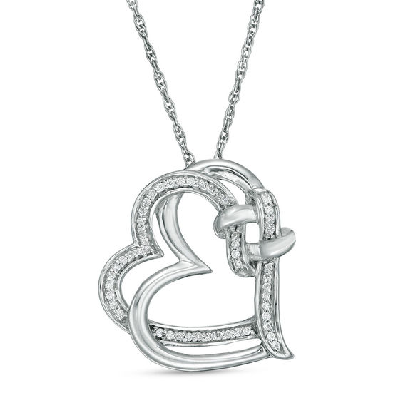 Honour her with this sentimental diamond tilted heart pendant. Crafted in sterling silver, this exquisite style showcases two looping heart outlines joined at the side by an elegant knot. Sparkling diamonds line one of the heart outlines and accentuate the knot design. Glittering with 0.086 ct. t.w. of diamonds and a brilliant buffed lustre, this lustrous pendant suspends slightly askew along an 18.0-inch rope chain that secures with a spring-ring clasp.