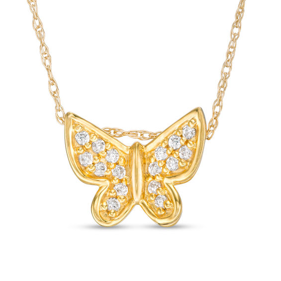 Elevate her attire with this sparkling diamond butterfly pendant. Crafted in warm 10K gold, these petite papillon wings are lined with shimmering diamonds. Radiant with 0.09 ct. t.w. of diamonds and a brilliant buffed lustre, this pendant suspends along an 18.0-inch rope chain that secures with a spring-ring clasp.