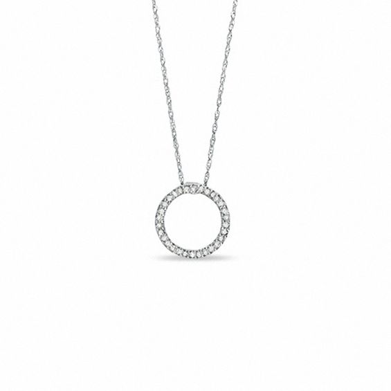 Simple but no less beautiful for its simplicity, we’ve taken an ordinary geometric shape and made something remarkable from it. Exquisite in 10K white gold, shimmering round diamonds totalling 0.09 ct. sparkle along the circle’s border with radiant brilliance. The look suspends from an 18.0-inch rope chain and secures with a spring-ring clasp.